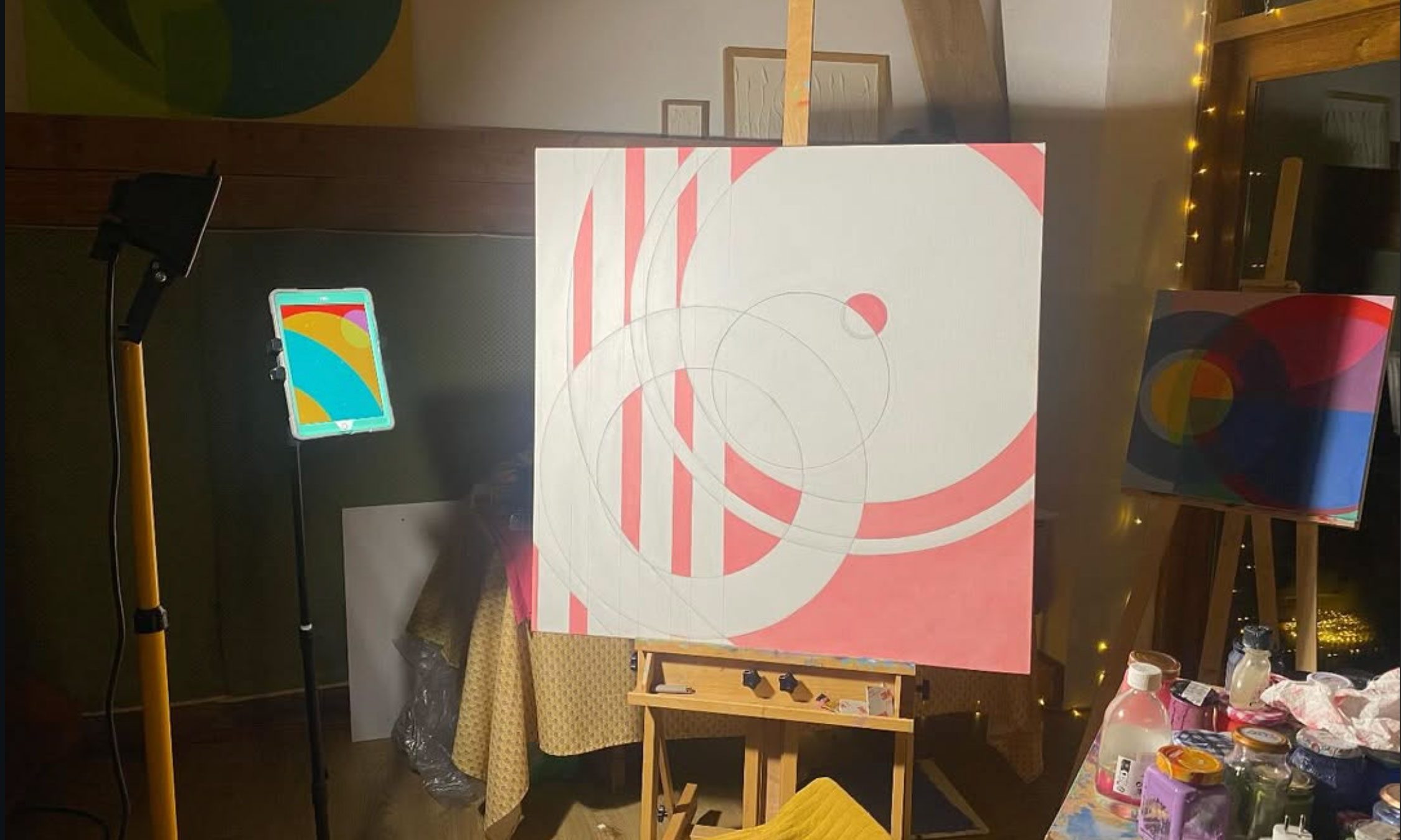 Her work explores the relationship between precision and colour. Each shape is meticulously hand-painted without the use of tape or stencils — a deliberate commitment to craftsmanship that distinguishes her practice. Subtle overlapping forms create translucent effects, allowing colours to interact and shift in intensity, producing compositions that feel both structured and fluid.