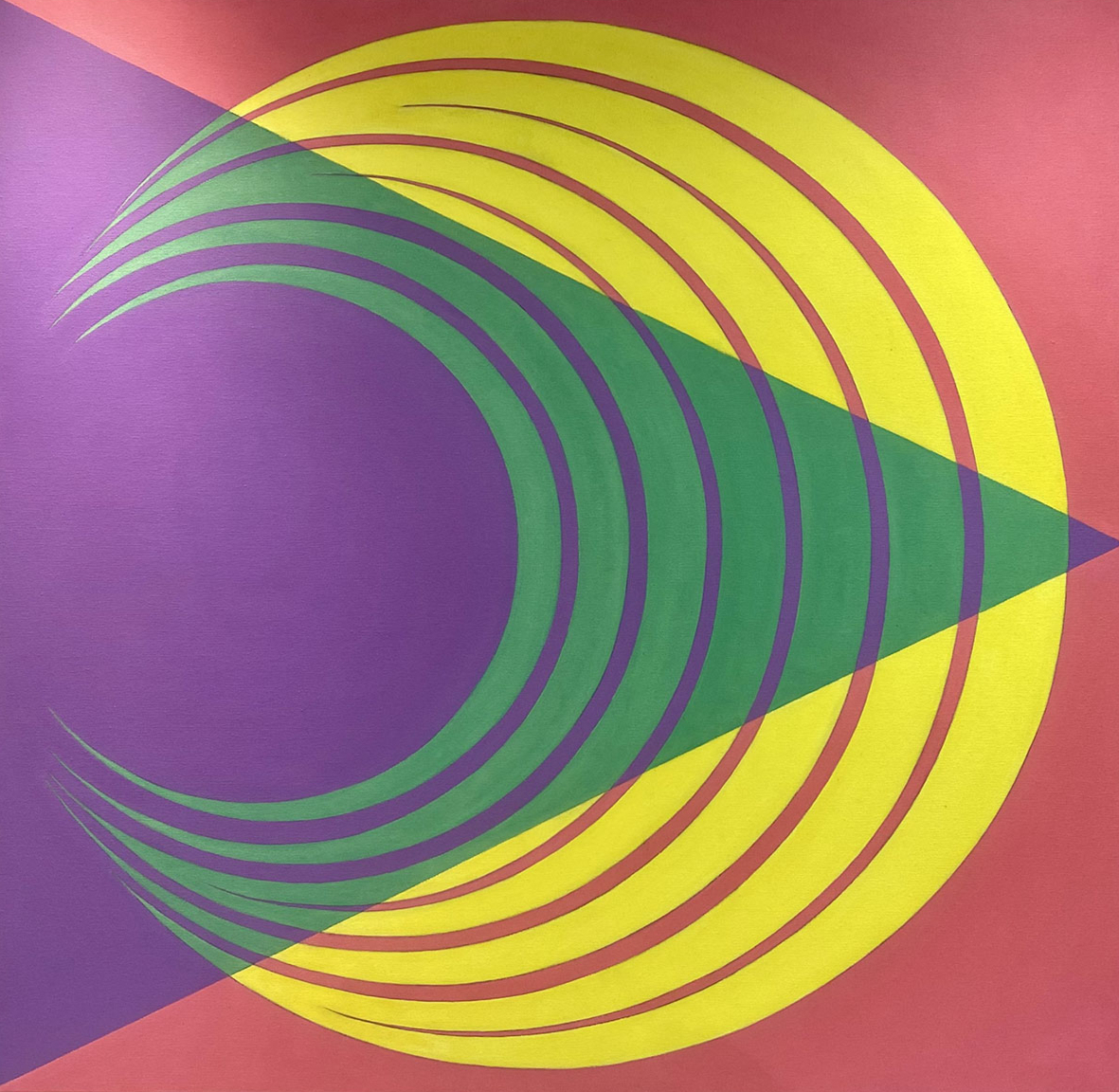 Layered crescent forms sweep across the composition, producing a dynamic rhythm of repetition and motion. Working with a limited palette of complementary colours, the painting explores the visual energy generated through contrast and directional geometry.